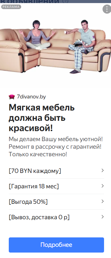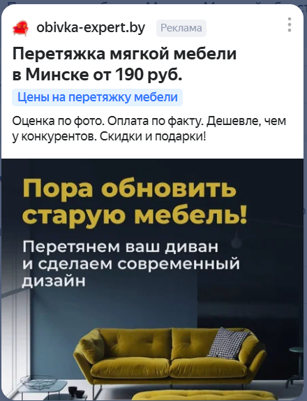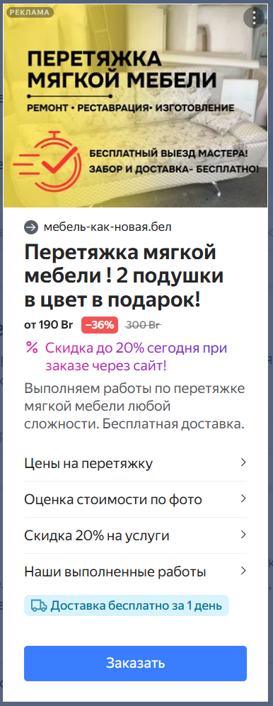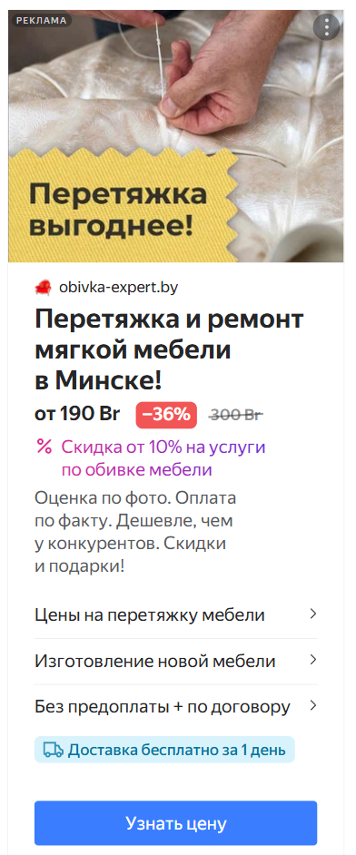 Почему это стоит своих денег: вы не платите только за клики — вы платите за моё время, опыт и ответственность. Я имею за плечами более 30 успешных запусков в нише ремонта и перетяжки мебели, поэтому умею: